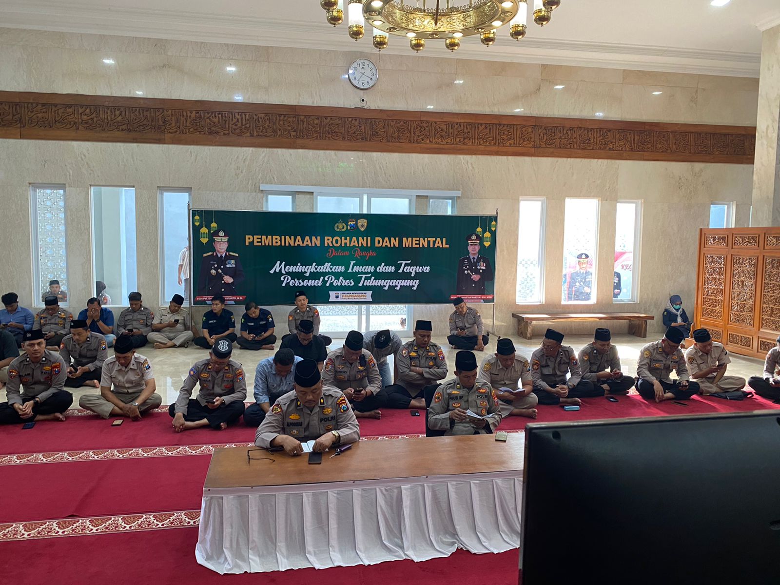 Tulungagung – Dalam rangka meningkatkan keimanan dan ketaqwaan kepada Tuhan Yang maha esa, Polres Tulungagung mengikuti kegiatan bimbingan rohani dan mental (Binrohtal) yang di senggelarakan oleh SDM Mabes Polri secara Zoom Meting di Masjid Al Hafidz Polres Tulungagung, Kamis (02/10/2025).