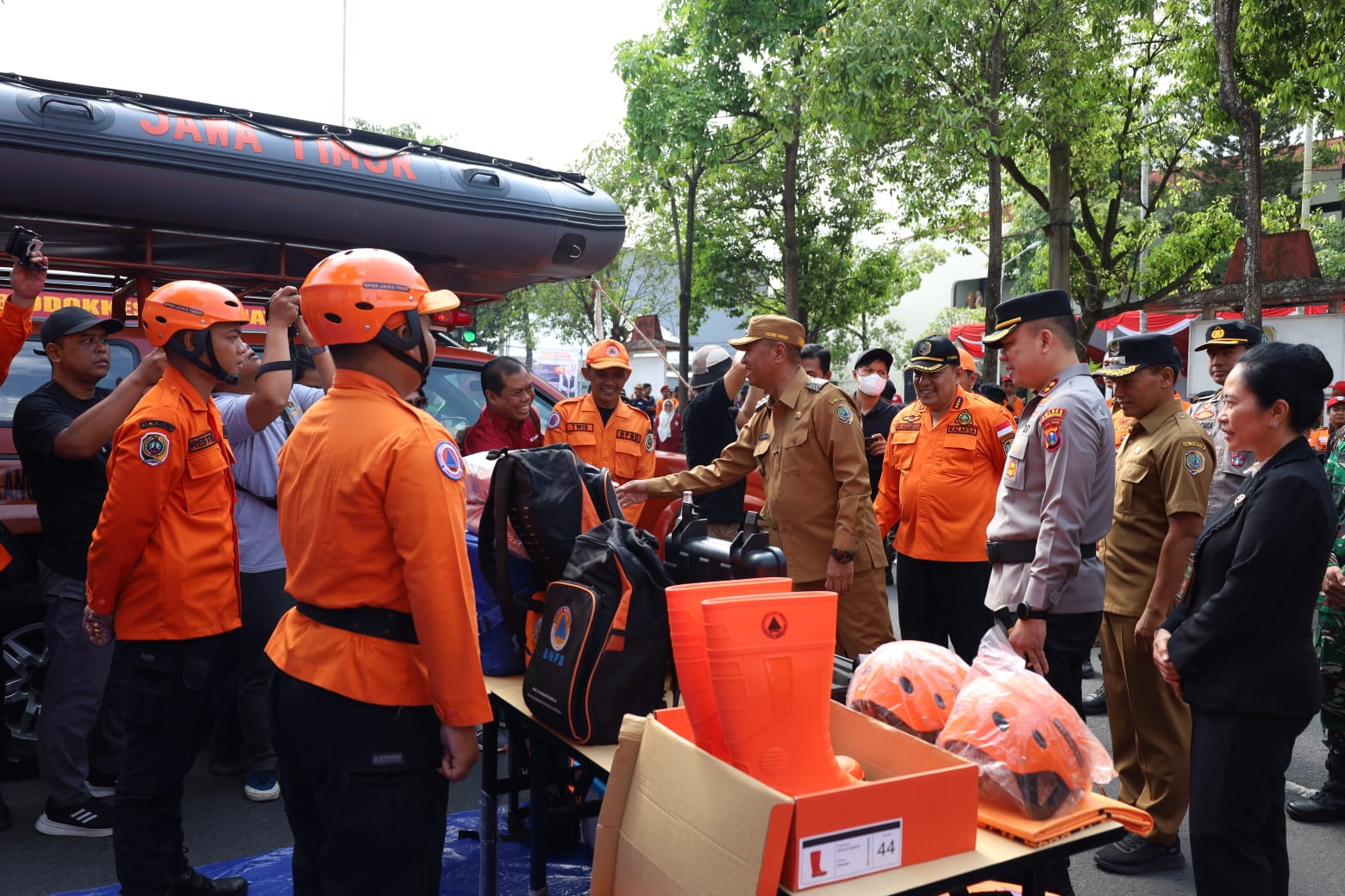 Dalam kegiatan tersebut juga dilakukan pengecekan peralatan dan kendaraan operasional penanggulangan bencana, seperti dapur umum, perahu karet, serta perlengkapan evakuasi dan komunikasi lapangan.