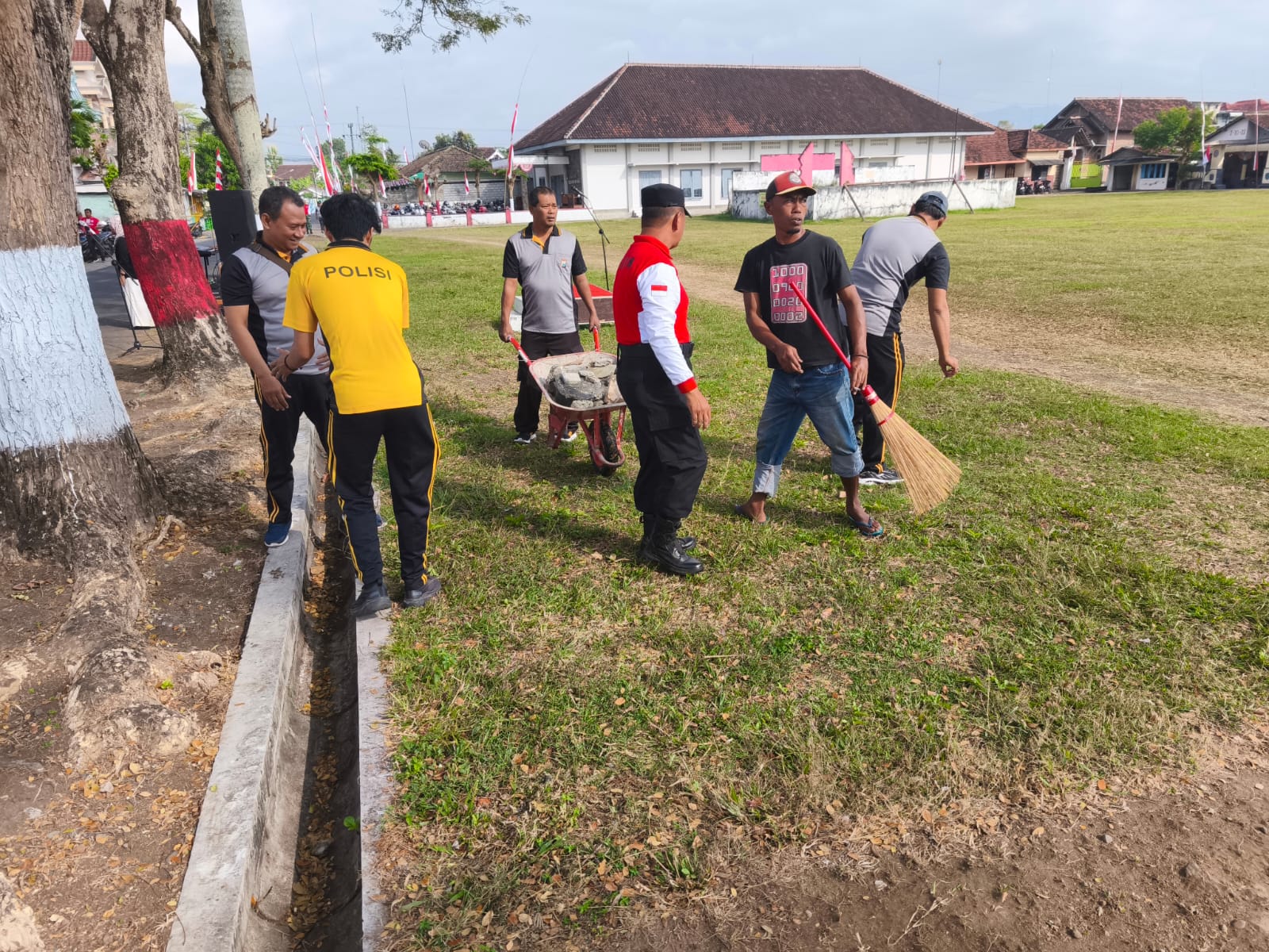 Dengan semangat gotong royong, seluruh peserta kegiatan membersihkan sampah, merapikan rumput, serta memastikan lapangan siap digunakan untuk upacara pada tanggal 17 Agustus mendatang.
